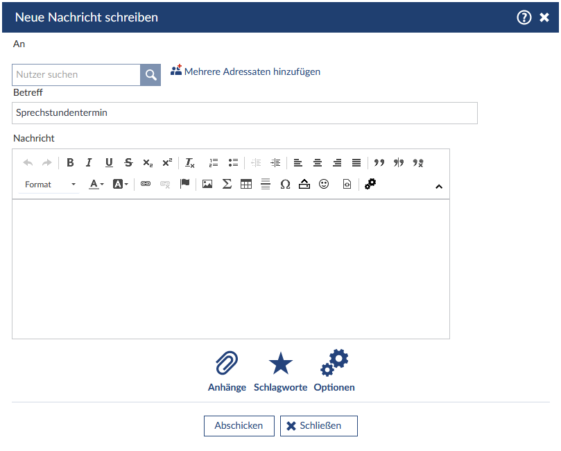 Diese Option öffnet die reguläre Nachrichtenfunktion in Stud.IP. Die Betreffzeile ist bereits ausgefüllt, Adressaten müssen selbstständig hinzugefügt werden.