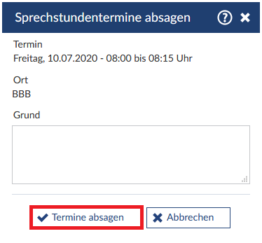 Diese Option bieten Ihnen die Möglichkeit alle gebuchten Termine für einen Tag abzusagen. Optional können Sie einen Grund für die Absage angeben.