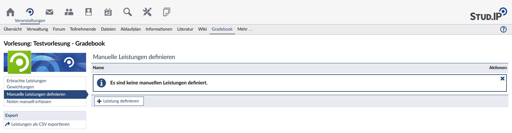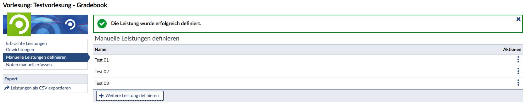 Leistungen können alle möglichen Produkte der Notenerfassung oder der Prüfungsvorleistungen sein. Beispiele sind: Protokolle, Tests, Präsentationen etc.