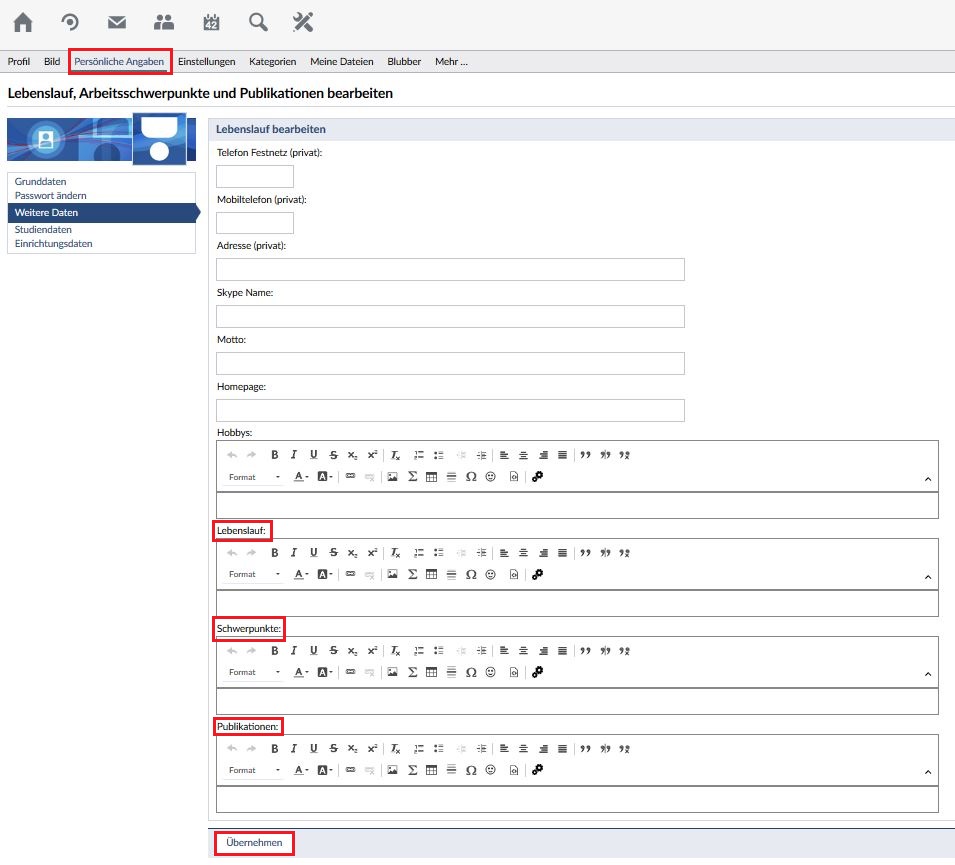 Im Bereich "Weitere Daten" können Sie Ihrem Profil eine weitere persönliche Note verleihen. So können Sie den anderen Nutzerinnen und Nutzern des System weitere Kontaktmöglichkeiten anbieten und etwas über sich schreiben.