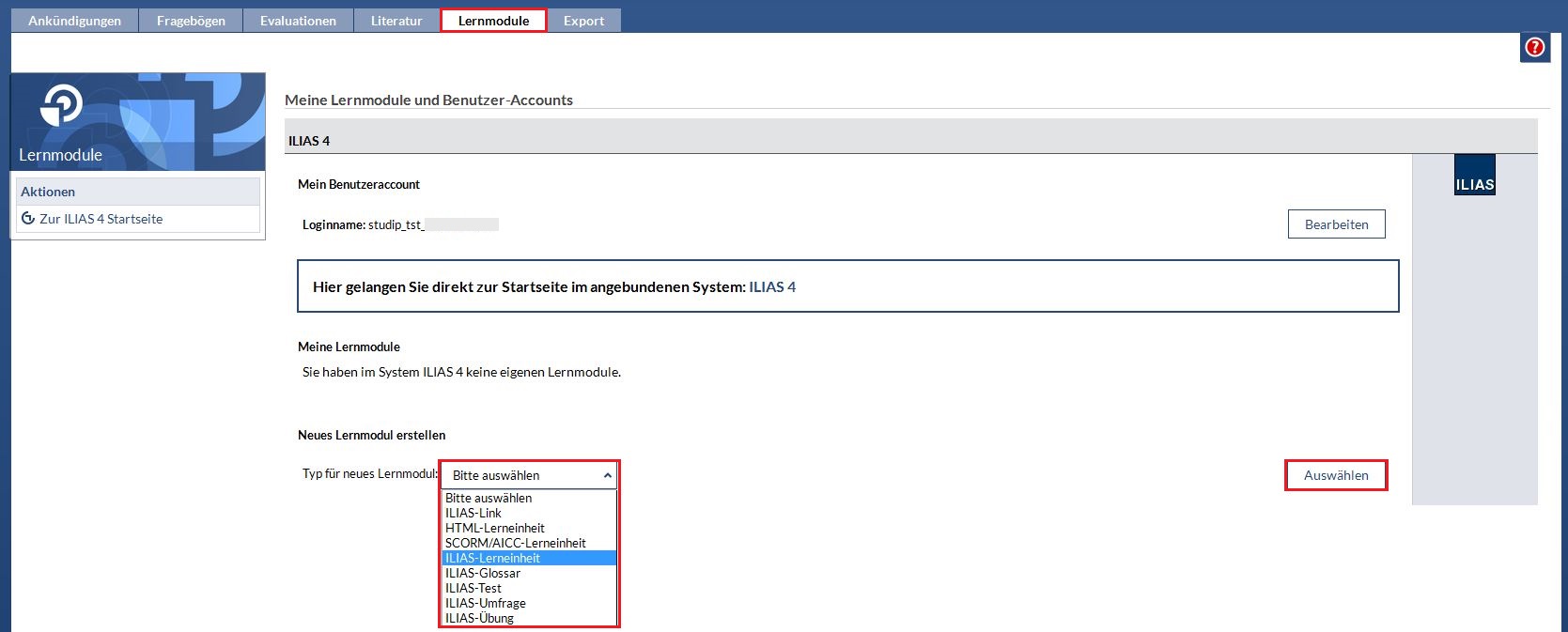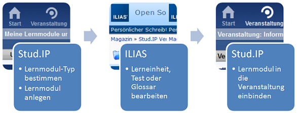 Folgende Schritte gehören zur Erstellung jeder Art von ILIAS-Modulen in Stud.IP: