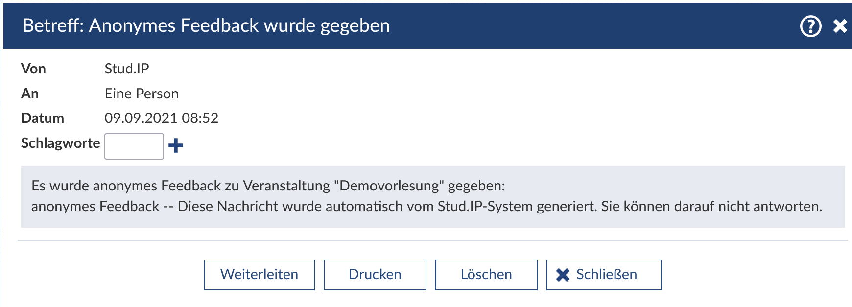 Für Studierende ist es möglich den Dozierenden einer Veranstaltung anonymes Feedback zu geben. Dieses anonyme Feedback ist ohne zeitliche Einschränkungen möglich im Gegensatz zu den Evaluationen. Die Dozierenden erhalten das anonyme Feedback über die Nachrichtenfunktion innerhalb von Stud.IP.