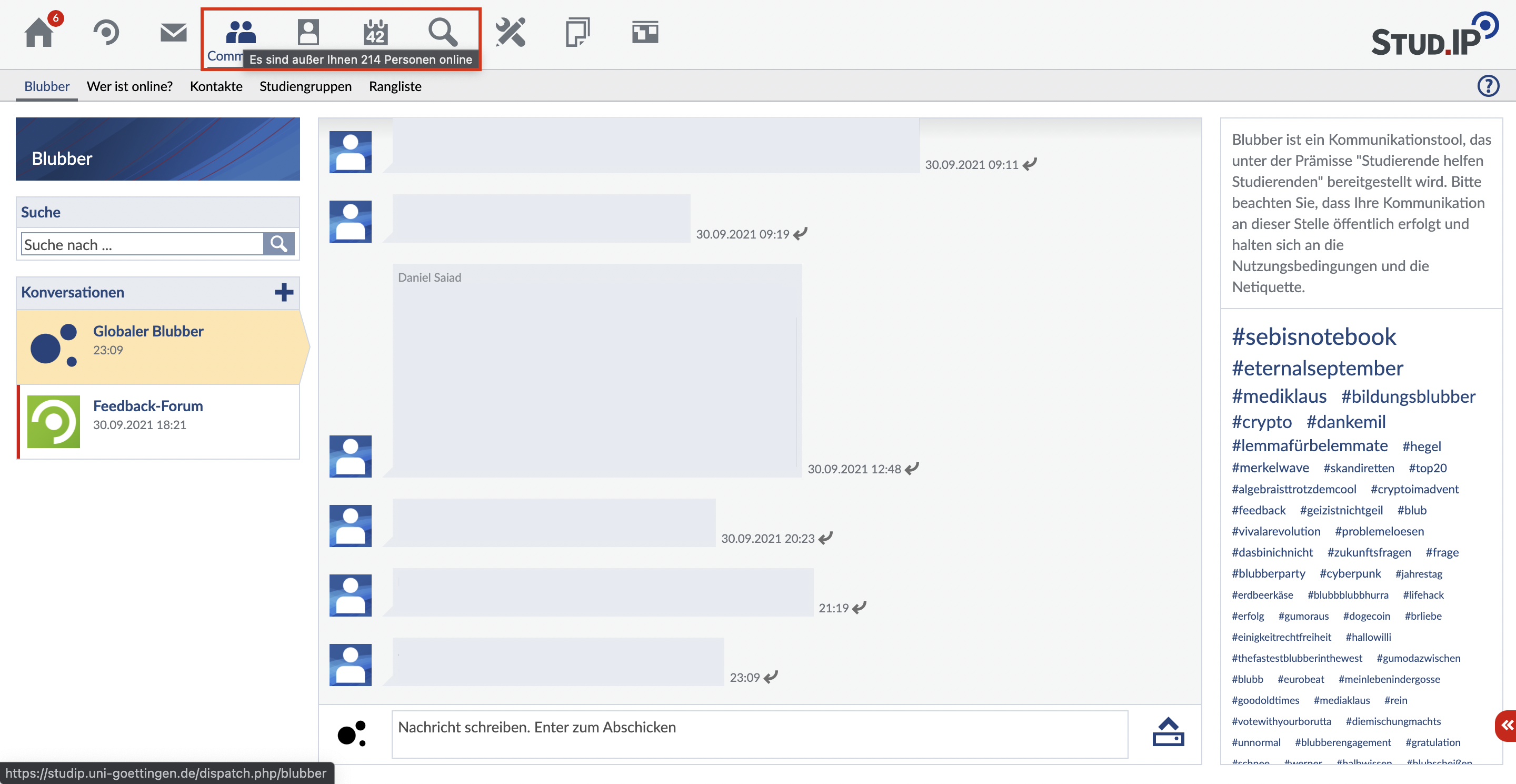 Wenn Sie auf das Community-Icon klicken, erscheint die standardmäßig die Blubber-Seite.
