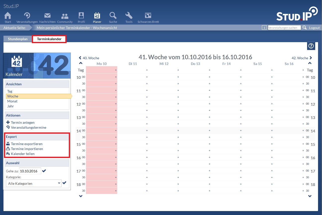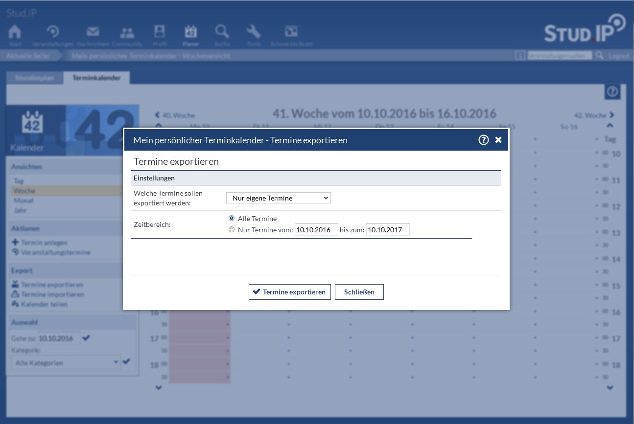 Unter diesem Punkt können Sie Ihre Termine exportieren. Hier können Sie auswählen, ob nur persönliche Termine, nur Veranstaltungstermine oder ob alle Termine exportiert werden sollen. Zusätzlich kann noch festgelegt werden, aus welchem Zeitbereich Termine exportiert werden sollen, also ob alle Termine exportiert werden oder nur ein bestimmter Zeitraum (bspw. ein Semester). Wählen Sie dazu „alle Termine“ aus oder geben Sie einen bestimmten Zeitraum an und bestätigen Sie Ihre Auswahl durch betätigen der Schaltfläche "Termine exportieren".