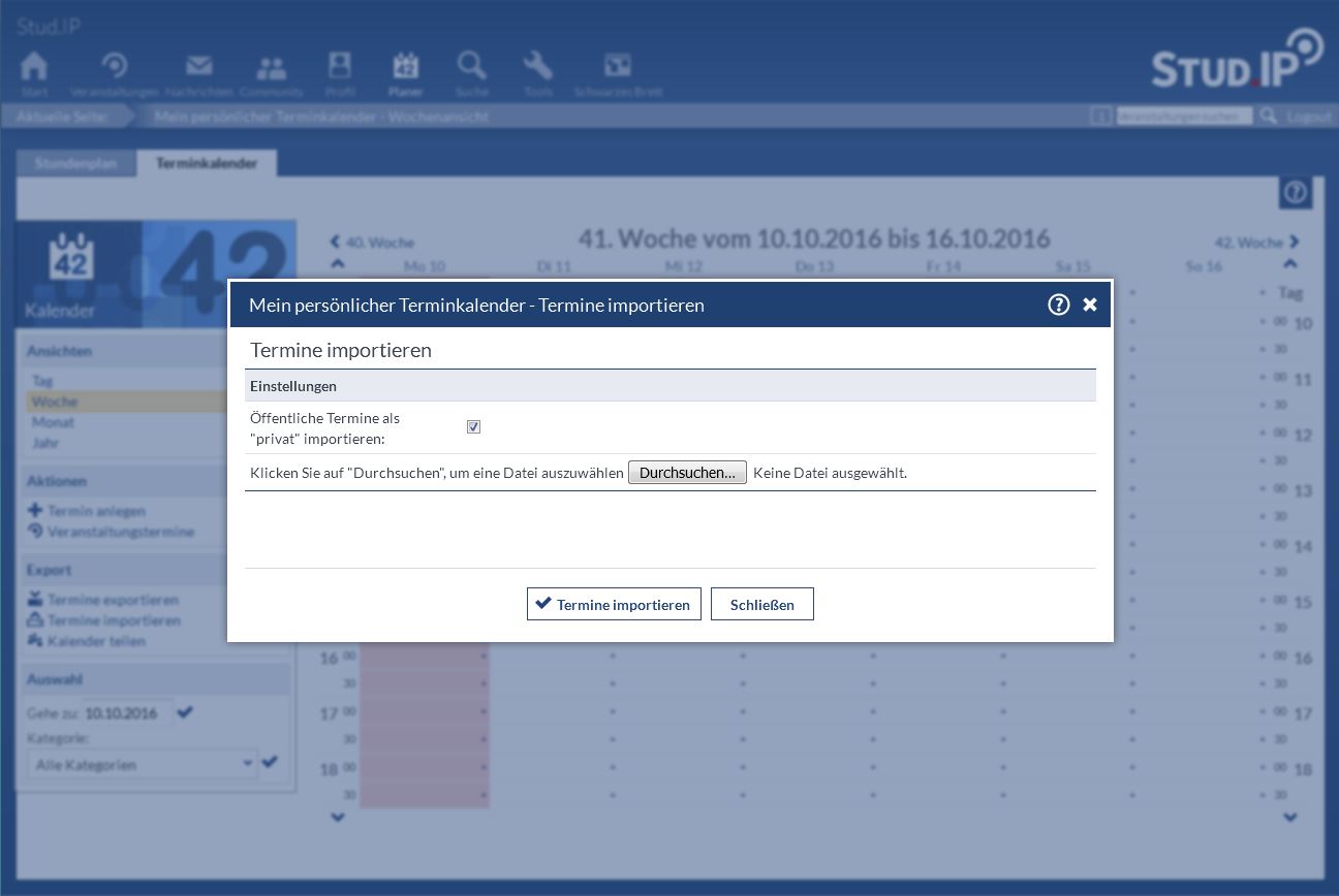 Hier können Sie Termine importieren, die sich in einer iCalendar-Datei befinden. Klicken Sie auf "Durchsuchen", um eine Datei auszuwählen und anschließend auf "Termine importieren", um die gewählte Datei hochzuladen.