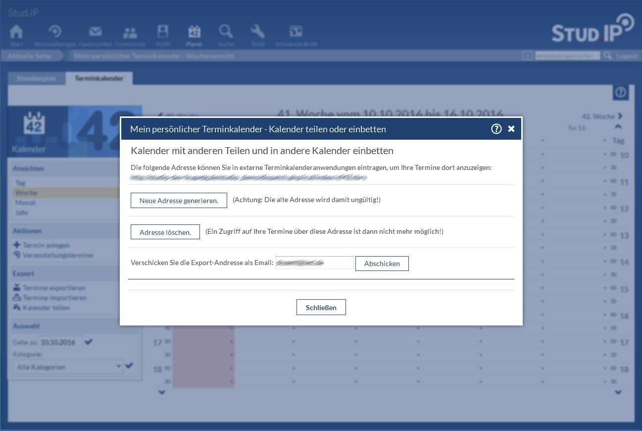 Unter diesem Punkt können Sie eine Web-Adresse generieren, um Ihre Termine aus Stud.IP in externen Terminkalendern anzeigen zu lassen. Die hier erzeugte Web-Adresse können Sie in externe Terminkalenderanwendungen eintragen, um Ihre Termine dort anzuzeigen. Klicken Sie zum Erzeugen der Web-Adresse auf „Adresse generieren!“ und tragen Sie die erzeugte Adresse dann in die externe Terminkalenderanwendung ein.