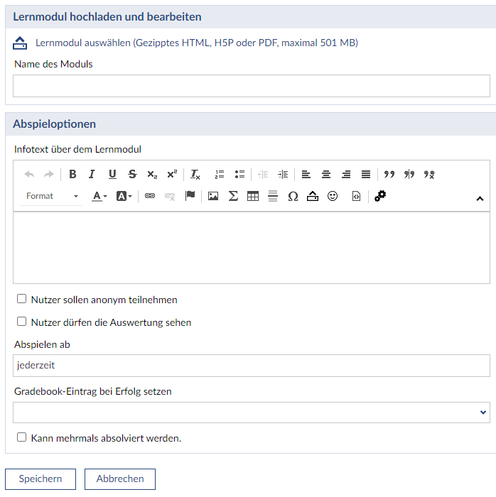 Laden Sie dafür eine Datei auf Ihrem PC hoch indem Sie "Lernmodul auswählen" anklicken. Sie können auch einen Infotext über dem Lernmodul anzeigen lassen. Zusätzlich können Sie entscheiden, ob Nutzer anonym teilnehmen können oder ob die Nutzer die Auswertung sehen können. Möchten Sie das Lernmodul erst zu einem späteren Zeitpunkt zur Verfügung stellen, legen Sie unter "Abspielen ab" ein Datum fest. Unter "Gradebook-Eintrag bei Erfolg setzen" können Sie ein bestehendes Gradebook auswählen um dort bei Absolvieren des Lernmoduls einen Eintrag zu setzen. Entscheiden Sie zum Schluss, ob das Modul mehrmals absolviert werden kann.