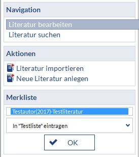 Um die gefundene Quelle in eine bestehende Literaturliste einzufügen, klicken Sie auf "Literatur bearbeiten" in der Sidebar. Sie sehen nun wieder die von Ihnen angelegten Listen. Unter Ihrer Merkliste gibt es nun zusätzlich noch ein Auswahlmenü zum Aufklappen.