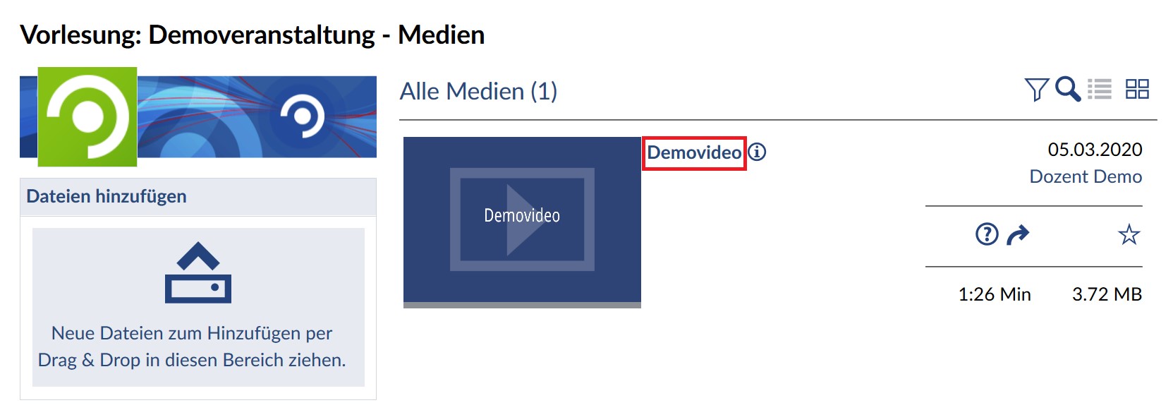 unausgefüllte Videokamera. Haben Sie Ihr Video auch außerhalb Stud.IP zugänglich gemacht, können Sie durch Klicken auf den