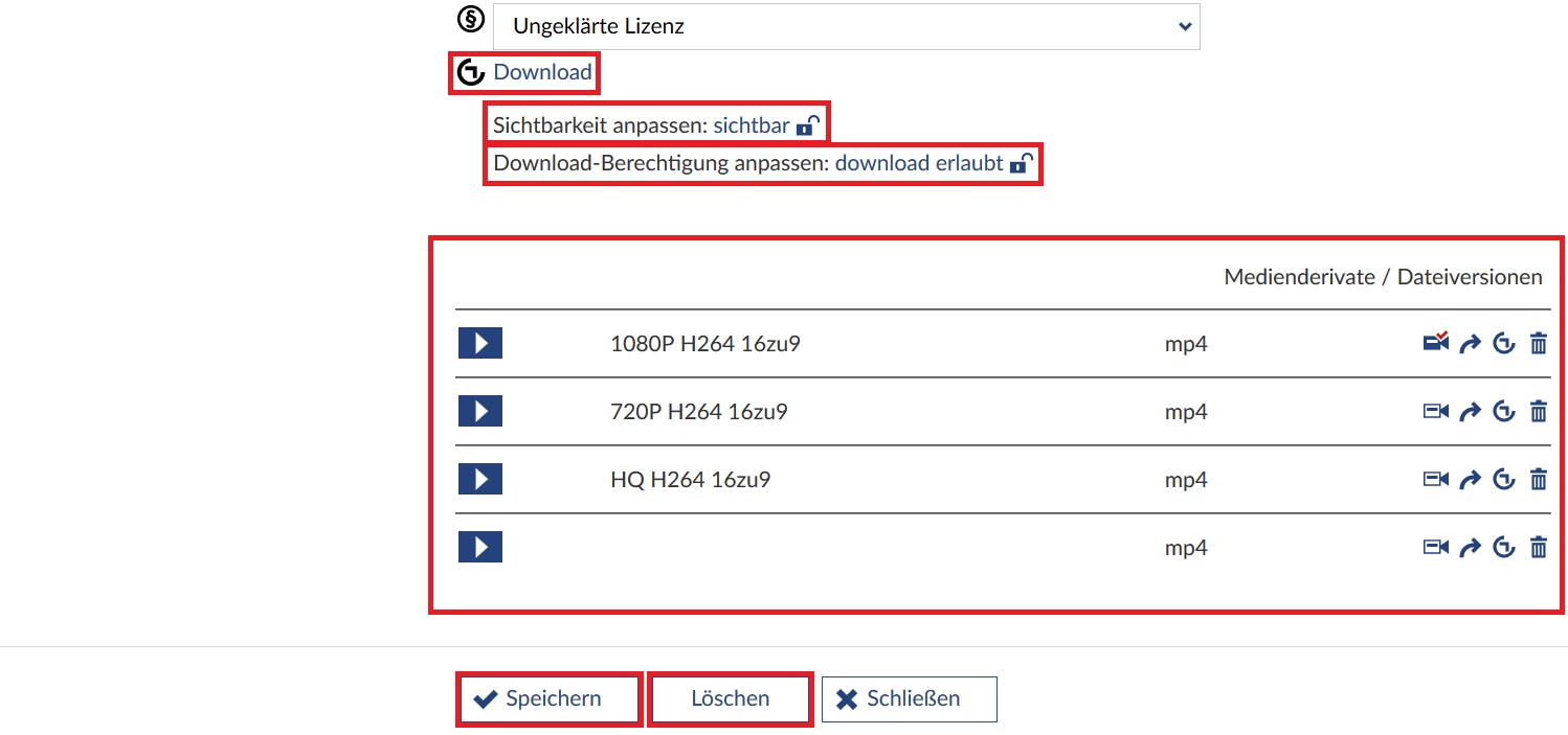 Darunter sehen Sie die Auflistung der Medienderivate / Dateiversionen. Um eine Version in einem neuen Fenster abzuspielen, klicken sie auf den