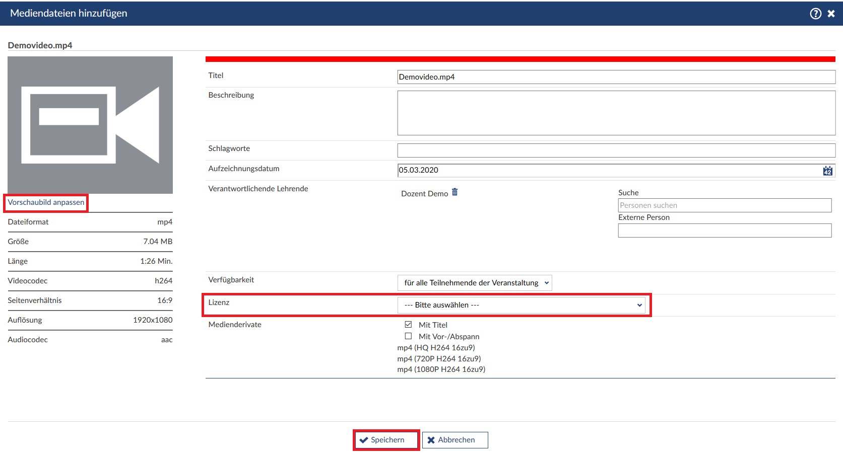 Das einzige, was sie festlegen müssen, um das Video hochzuladen, ist die Art der Lizenz. Als letztes können Sie festlegen, ob vor dem Video der Titel angezeigt werden soll und ob der Vor-/Abspann der Universität Göttingen hinzugefügt werden soll. Zusätzlich können Sie auch ein Vorschaubild festlegen, in dem Sie eine Bilddatei hochladen.