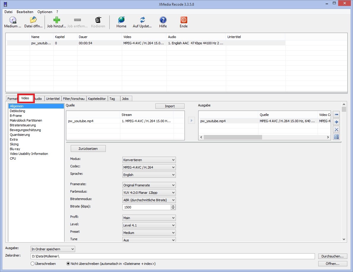 Neben Video- und Audio-Codec, Bitrate oder auch Lautstärke können Sie im „Video-“ und „Audio-“Reiter auch viele andere Parameter ändern. Bitte benutzen Sie hier einfach die vorausgewählten Einstellungen.