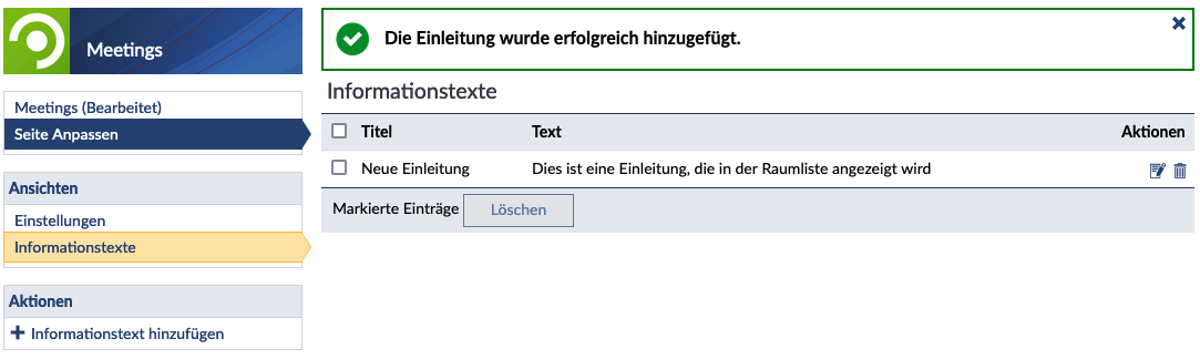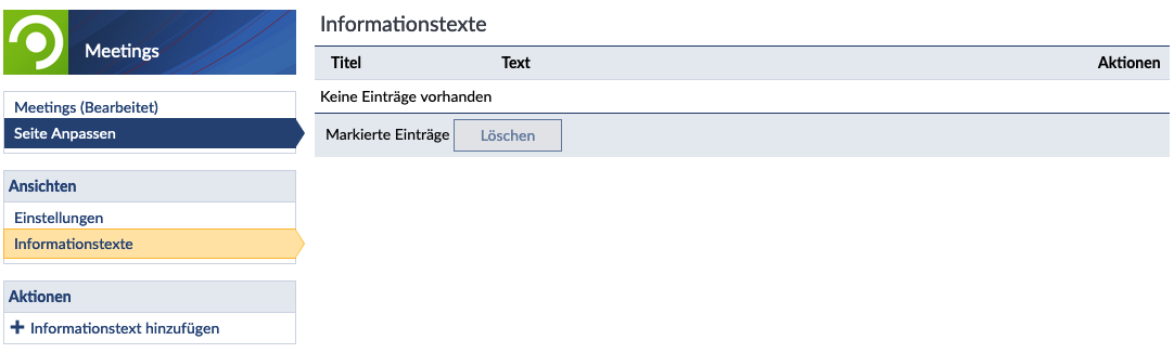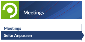 Mit dieser Funktion können Sie die Erscheinung des Meetings-Werkzeugs anpassen. Aktuell können Sie einen Einleitungstext hinterlegen und den Namen von Meetings in der Navigationsleiste ändern.