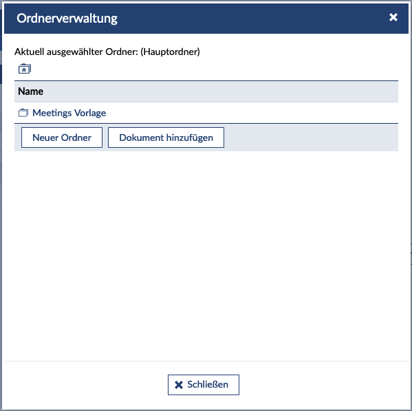 Dies ist eine neue Funktion die ab der Version 2.80 in Meetings verfügbar ist. Inhalte aus dem Dateibereich der Veranstaltung können hiermit in einer kompakten Ansicht verwaltet werden. Die Ordnerverwaltung finden Sie in der Seitenleiste im Bereich "Ordner".