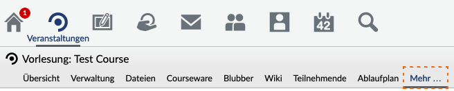 In der Kursnavigationsleiste (sekundäre Navigation), sollten Sie eine Schaltfläche namens "Mehr…" finden. Wird Ihnen diese nicht angezeigt, so haben Sie vermutlich nicht die notwendige Rechtestufe innerhalb der Veranstaltung. In diesem Fall lassen Sie sich als Lehrender oder Tutor eintragen.