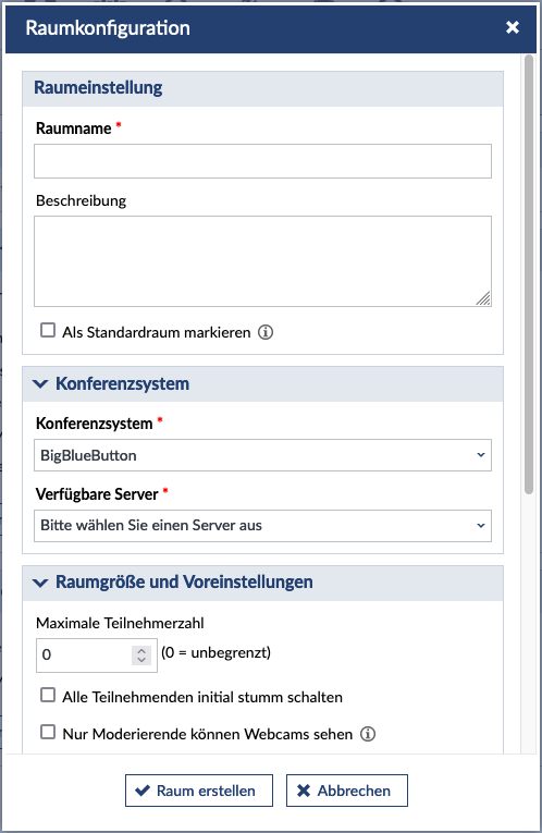- Raum löschen: löscht den Raum, diese Aktion muss bestätigt werden.