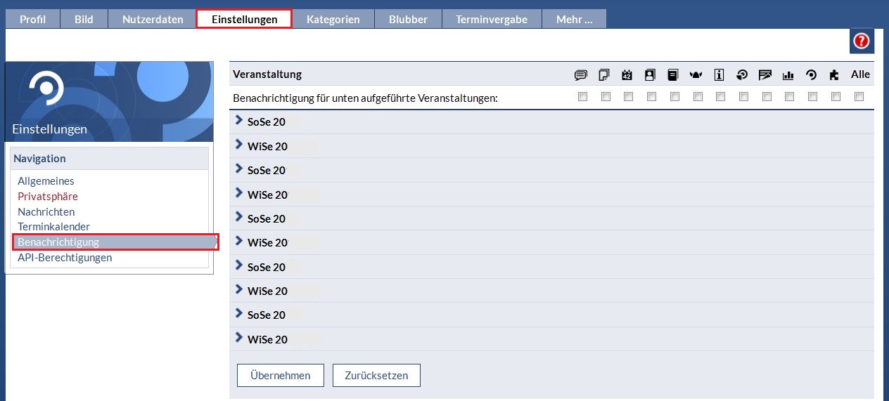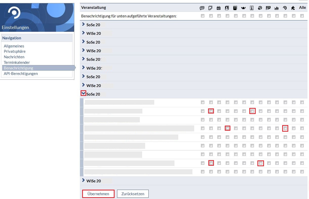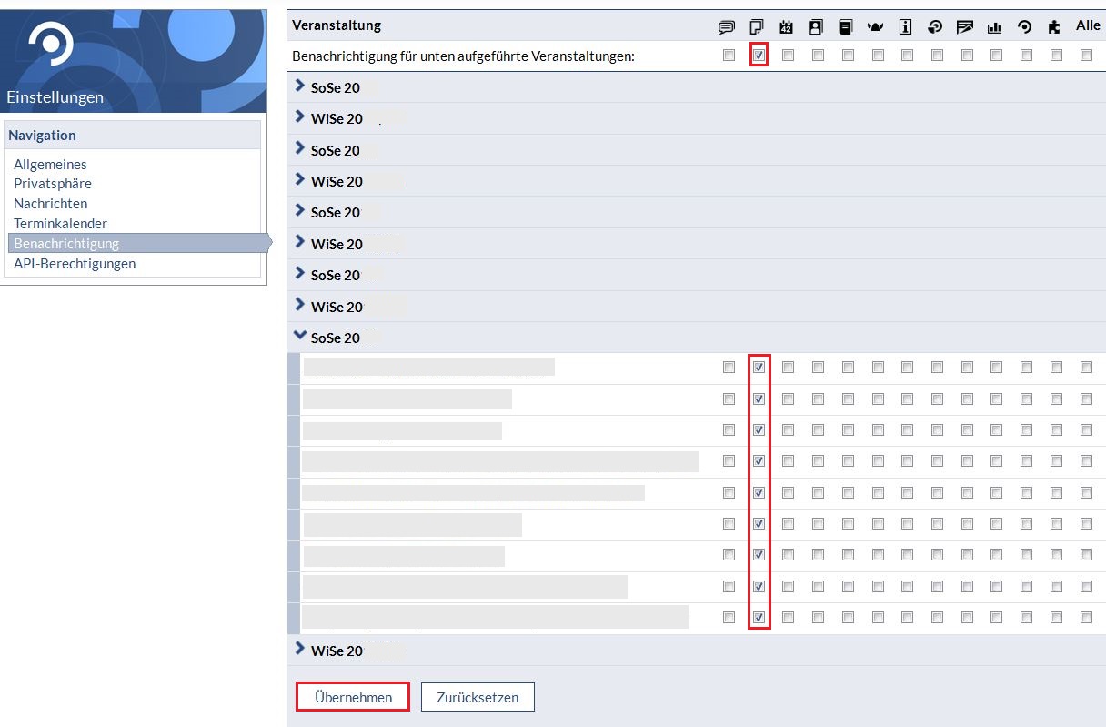 Wählen Sie mit dem Pfeil neben dem Semesternamen das Semester aus, in denen die Veranstaltungen sind, aus denen Sie die Benachrichtigungen bekommen möchten.