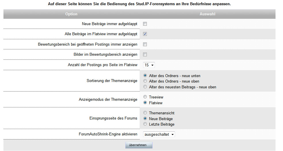 Sie können direkt von Ihrer Übersichtsseite in ein Forum einspringen. Hier können Sie festlegen, in welcher Ansicht Sie damit landen: möglich sind die Themenansicht, die Seite mit den neuen Beiträgen (die, die seid Ihrem letzten LogIn geschrieben wurden) sowie die Seite mit den letzten Beiträgen (die Sie schon gelesen haben können).