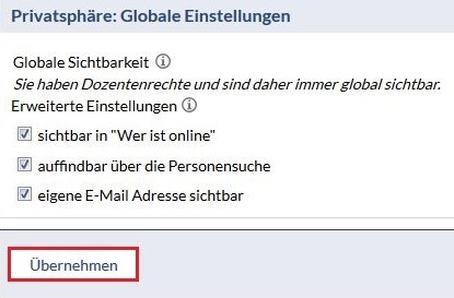Hier können Sie einstellen, wie Sie global innerhalb des Systems auffindbar sein wollen. Der Punkt "globale Sichtbarkeit" legt dabei fest, ob Sie grundsätzlich auffindbar sind. Hier "unsichtbar" auszuwählen, führt also dazu, dass Sie innerhalb von Stud.IP gänzlich unauffindbar sind, weder über die Personensuche noch über die Liste der momentan eingeloggten Personen. Auch Ihr Profil wird für andere nicht sichtbar sein. Möglicherweise können Sie diese Sichtbarkeitseinstellung nicht verändern, das liegt an der globalen Konfiguration des Systems, die von der Administration Ihres Stud.IP-Standortes vorgenommen wurde. Neben dieser allgemeinen Sichtbarkeit können Sie festlegen, dass Sie zwar global sichtbar, aber in bestimmten Bereichen des Systems ausgeblendet sein möchten. Hier gibt es die Möglichkeit, sich in der der "Wer ist online"-Liste oder der Suche nach Personen unsichtbar zu schalten, den eigenen Chatraum aus der Liste aktiver Chats auszublenden oder die eigene Emailadresse unsichtbar zu schalten.