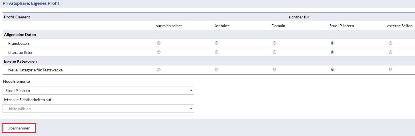 meine Nutzerdomäne: falls es an Ihrem Standort Nutzerdomänen in Stud.IP gibt, können Sie die Felder Ihres Profils auch für die Personen innerhalb Ihrer eigenen Nutzerdomäne freigeben