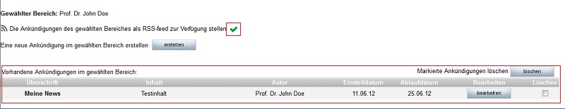 Mit einem Klick auf das kleine rote Kreuz (in der Abbildung rot eingefasst), können Sie die News des ausgewählten Bereichs als RSS-Feeds anbieten. Zum Erstellen weiterer oder neuer Benachrichtigungen, klicken Sie auf "erstellen".