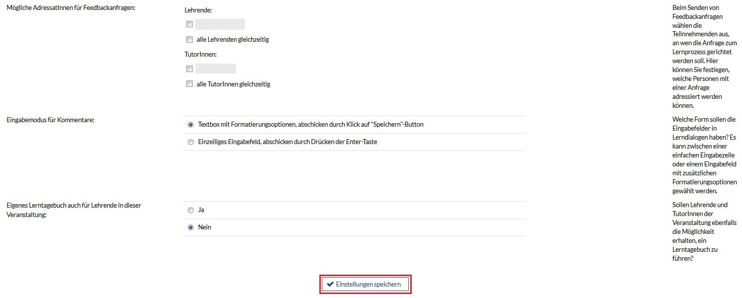 Sie können wählen, ob Lerntagebücher in dieser Veranstaltung verfügbar sind und ob sie vor der Benutzung erst aktiviert werden müssen.