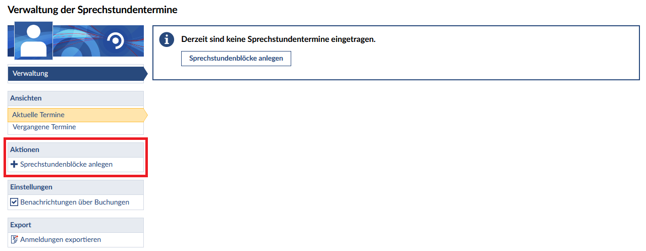 Sprechstundentermine werden in Stud.IP in Form von Sprechstundenblöcken verwaltet. Wenn Sie das erste Mal Termine anlegen, können Sie
