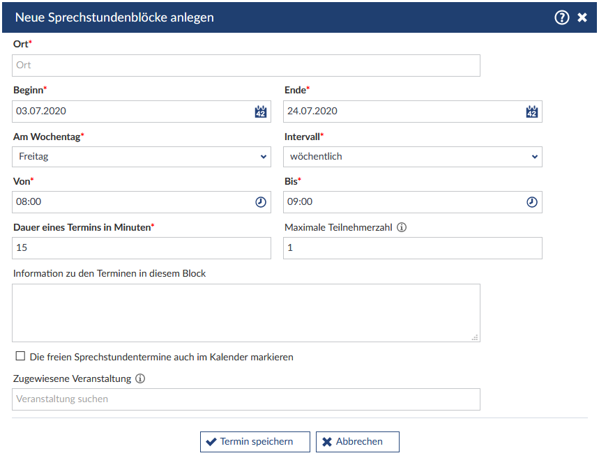Folgende Parameter müssen festgelegt werden um einen Sprechstundenblock anzulegen: