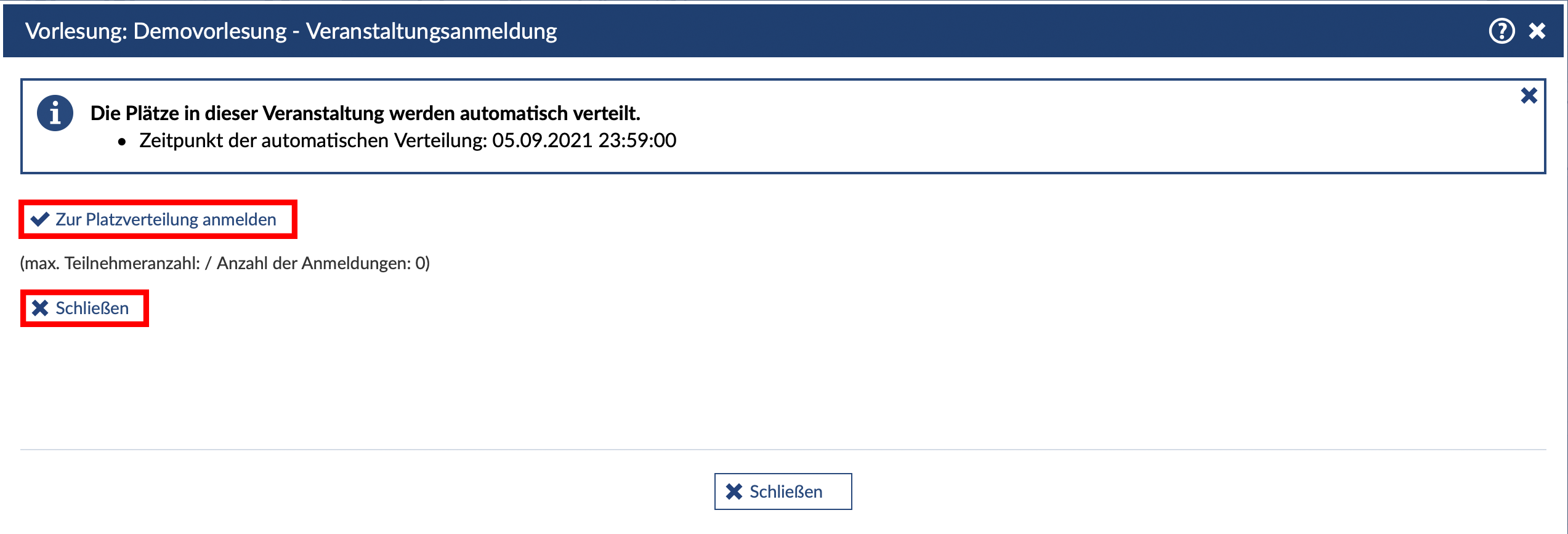 Um sich für das Losverfahren anzumelden, klicken Sie, nachdem Sie Zugang zur Veranstaltung gewählt haben, "Zur Platzverteilung anmelden". Nach der Anmeldung kann das Fenster mit "Schließen" geschlossen werden. Nach der automatischen Platzvergabe erhalten Sie die Nachricht, ob Sie in die Veranstaltung aufgenommen wurden oder nicht.