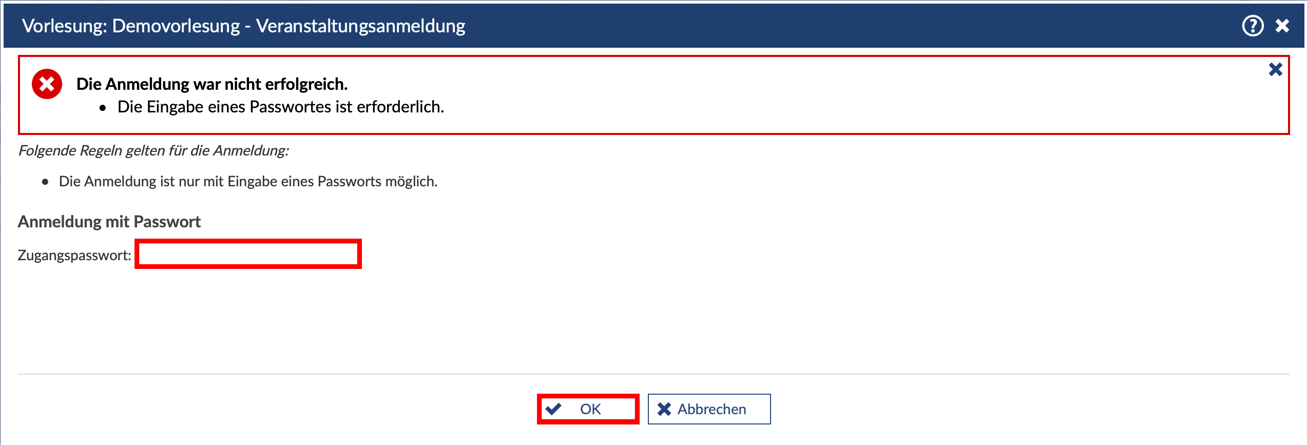 Sollte ein Passwort für die Anmeldung erforderlich sein, geben Sie dieses in dem entsprechenden Feld ein und klicken auf "OK". Sobald Sie "OK" geklickt haben, sind Sie in der Veranstaltung angemeldet. Das Passwort wird meist vergeben, wenn bestimmte Voraussetzungen von Seiten der Studierenden erfüllt sein müssen und Sie erhalten es gewöhnlich von den Dozierenden.