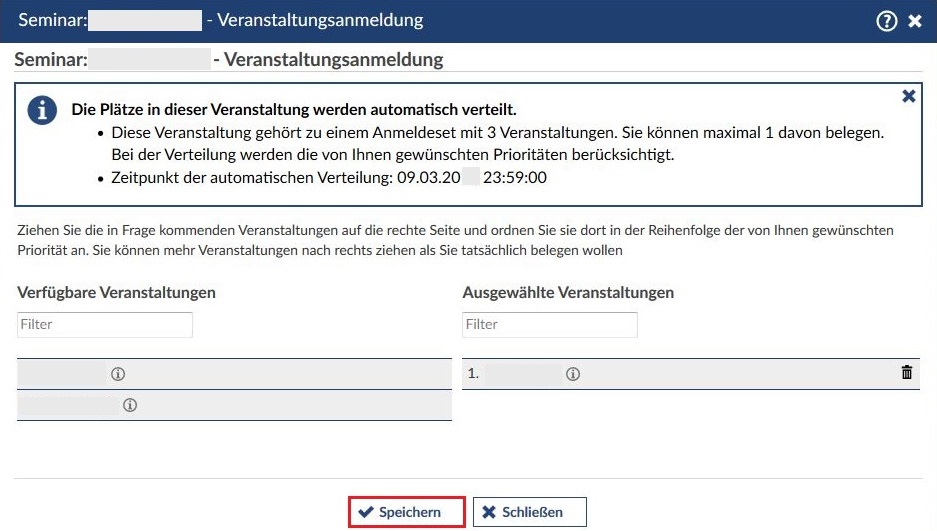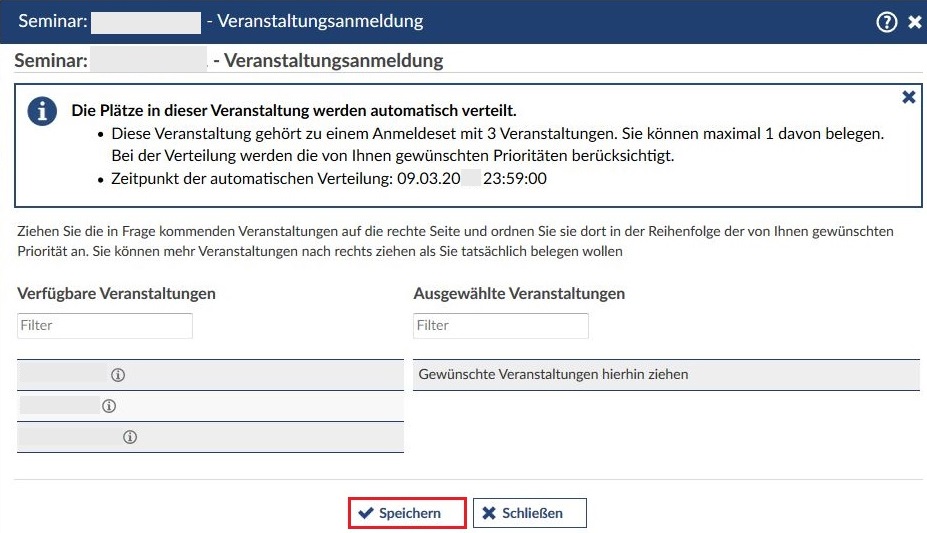 Öffnet sich das Fenster zur Anmeldung, werden im oberen Kasten die Anzahl der Veranstaltungen angezeigt, zu der eine Anmeldungen möglich ist, sowie der Zeitpunkt, an dem die automatische Platzverteilung stattfindet.