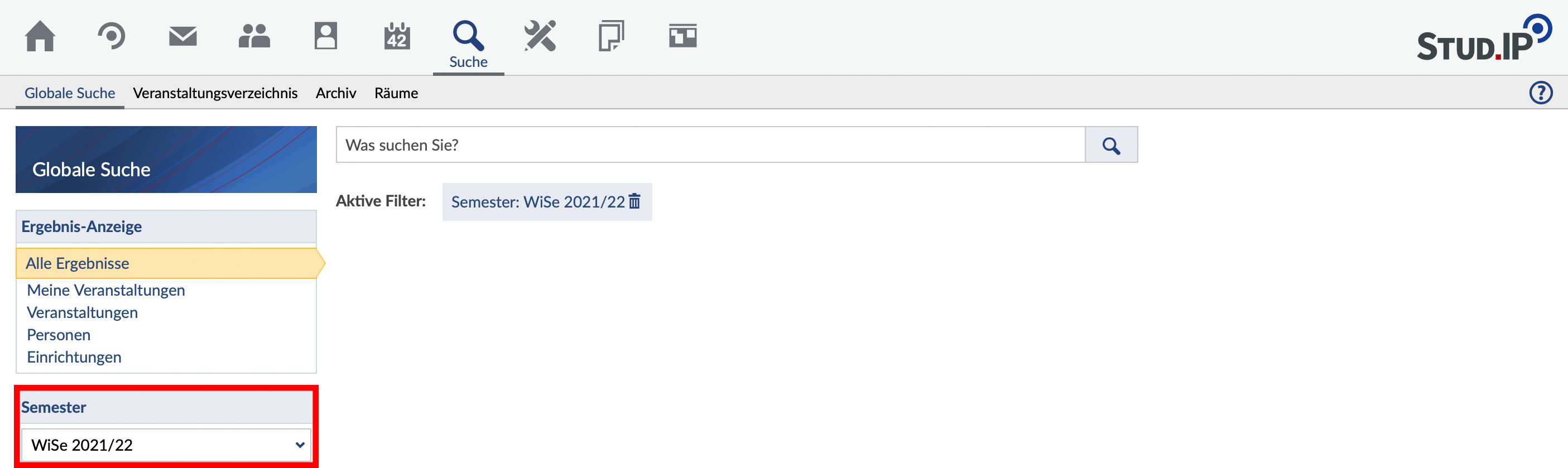 Achten Sie darauf, dass das richtige Semester im Suchfenster eingestellt ist!