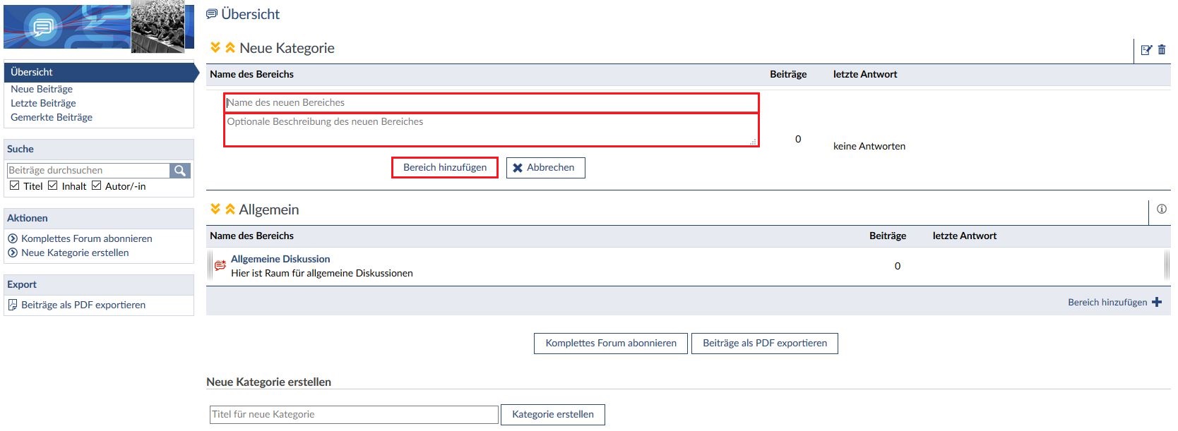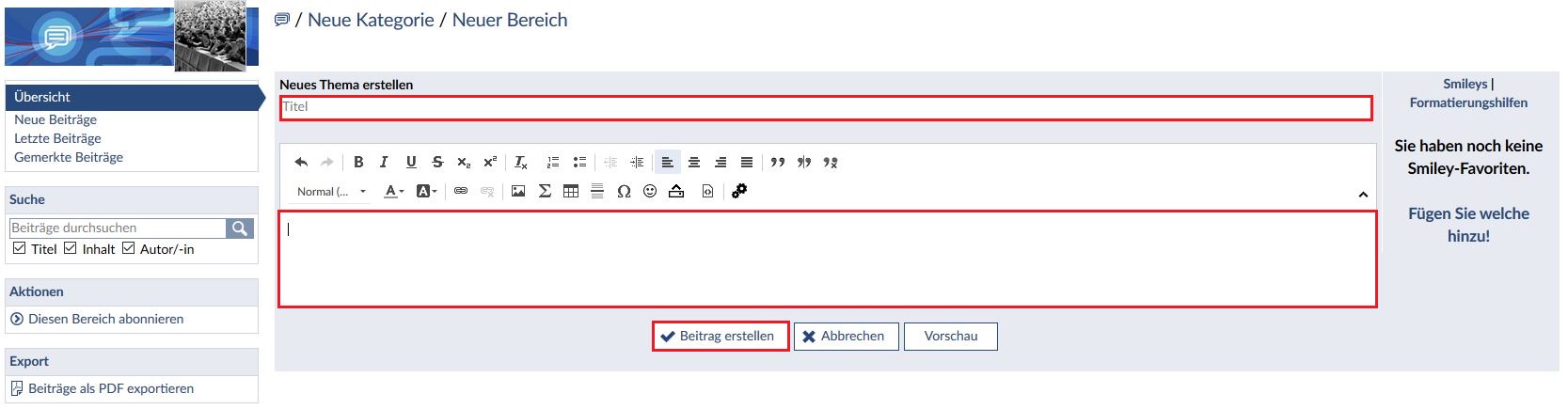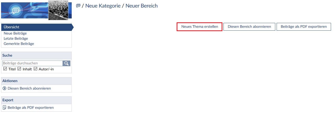 Nun können Sie in der neu erstellen Kategorie einen neuen Bereich erstellen. Geben Sie dem Bereich einen passenden Namen und ggf. eine nähere Beschreibung, wofür dieser Bereich gedacht ist. Innerhalb des Bereichs können dann Themen eröffnet werden, in denen die konkrete Diskussion stattfindet.