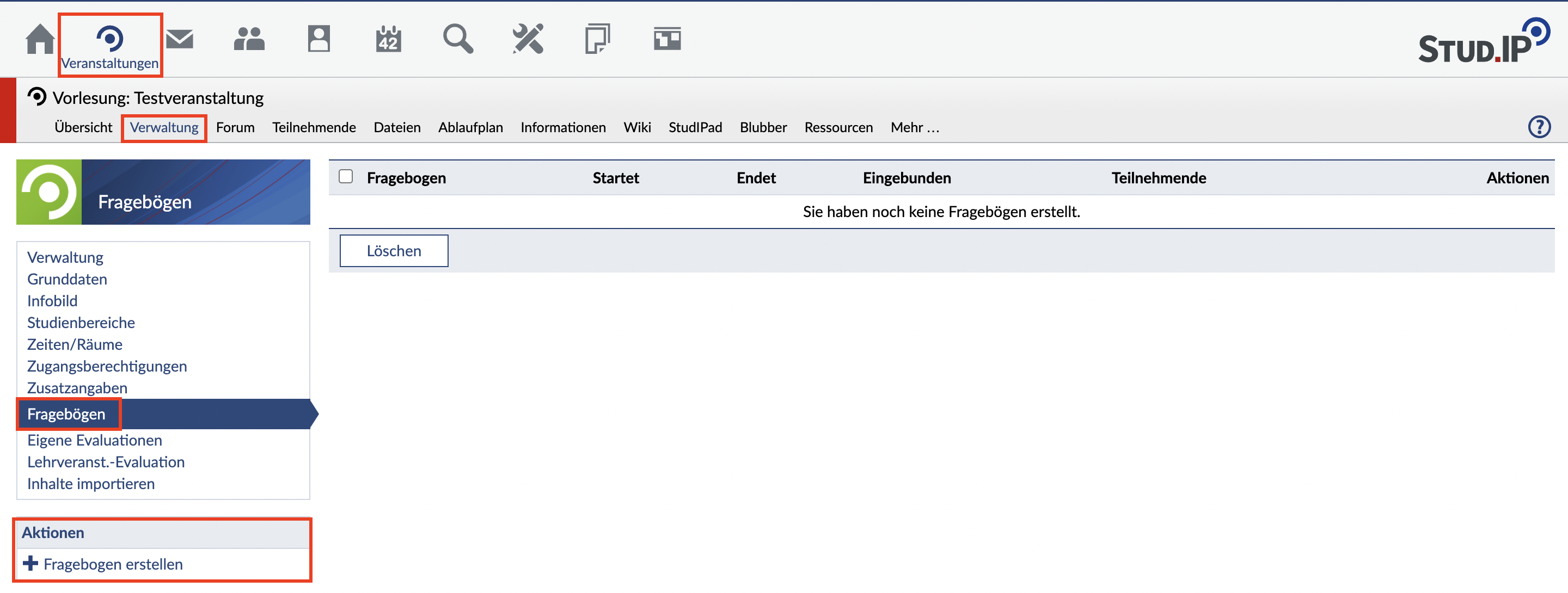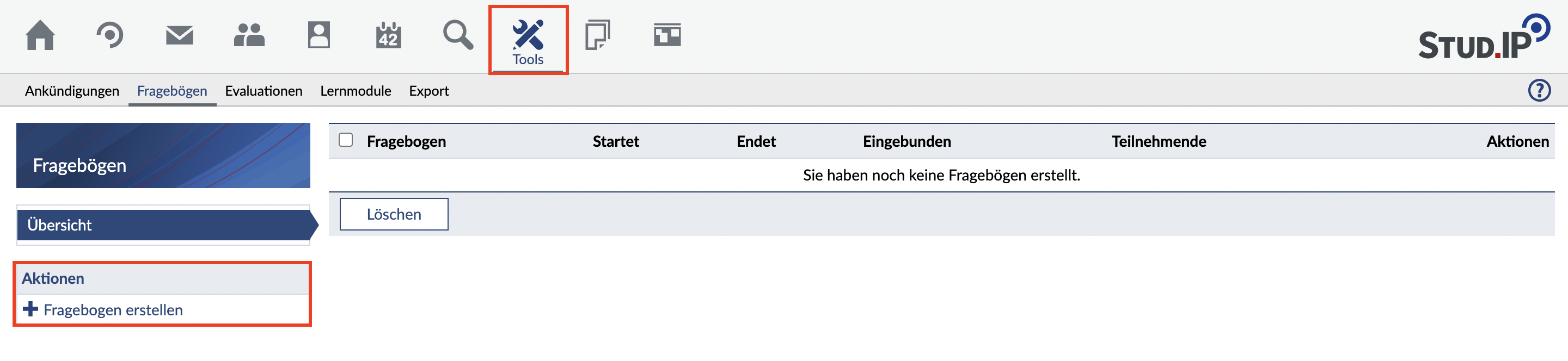 Um einen Fragebogen zu erstellen, wählen Sie "+ Fragebogen erstellen" aus.