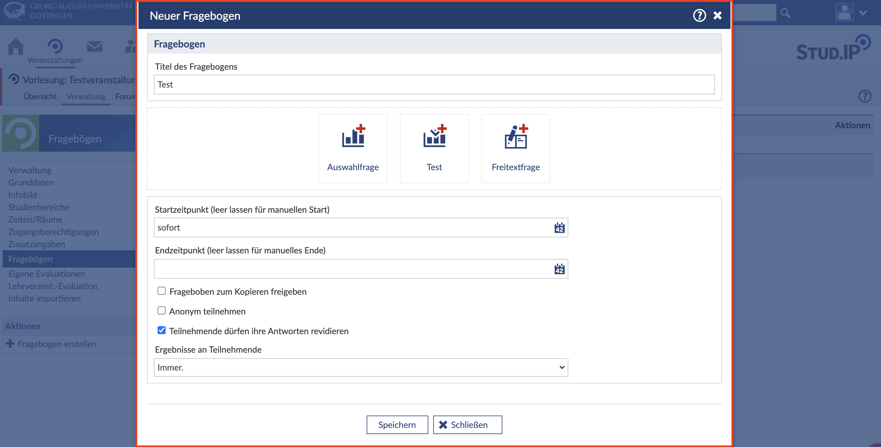 Sie können den Fragebogen sofort starten oder einen bestimmten Zeitpunkt angeben, zu dem der Fragebogen automatisch gestartet werden soll. Sie können das Feld auch leer lassen, so können sie den Fragebogen manuell starten.