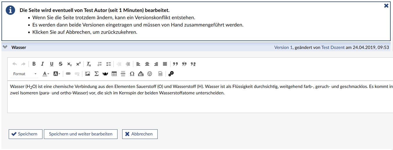 Wenn mehr als eine Person gleichzeitig versucht, eine Seite zu ändern, erscheint ein Warnhinweis. Stud.IP kann leider nicht erkennen, ob tatsächlich mehrere Nutzende gleichzeitig einen Text bearbeiten, oder ob jemand nach dem Aufruf des Bearbeitungsfensters auf eine andere Webseite gewechselt ist, den Rechner ausgeschaltet hat o.ä. Deshalb wird jeweils dreißig Minuten lang nach Beginn der Bearbeitung für andere ein Warnhinweis ausgegeben, bis die Seite abgeschickt oder die Bearbeitung abgebrochen wird.
