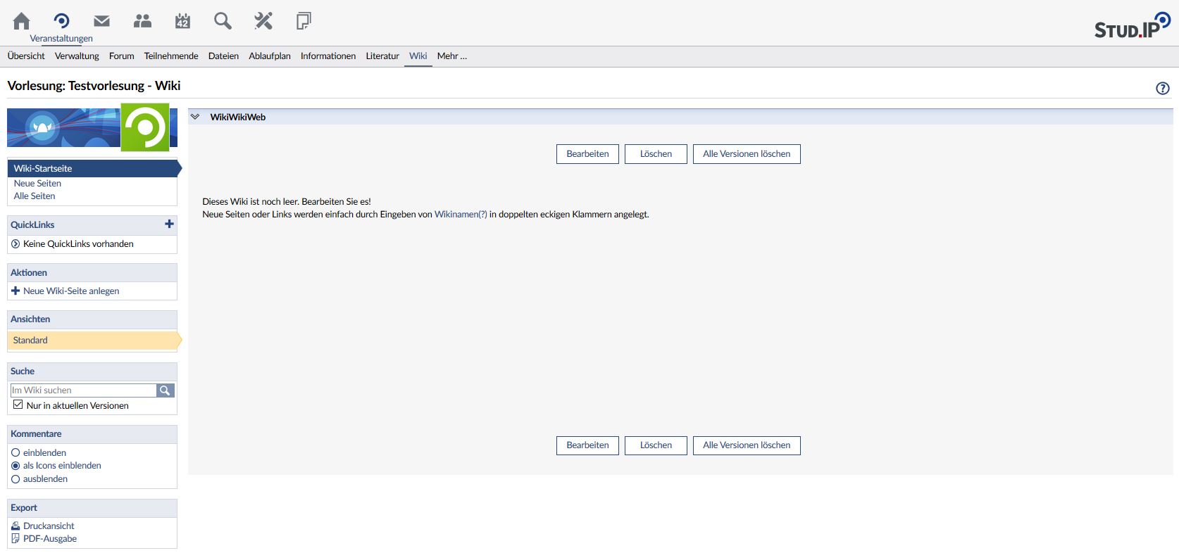 Ein Wiki beginnt in Stud.IP immer mit einer Startseite, die WikiWikiWeb heißt. Diese Seite können Sie wie eine gewöhnliche Webseite lesen und den Links auf dieser Seite folgen.