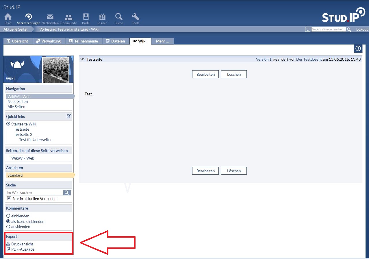 - PDF-Export: Hiermit bekommen Sie ein PDF, das die aktuelle Seite des Wikis anzeigt inklusive Bilder und Links. Diese Seite können Sie ausdrucken oder lokal auf Ihrem Rechner abspeichern.