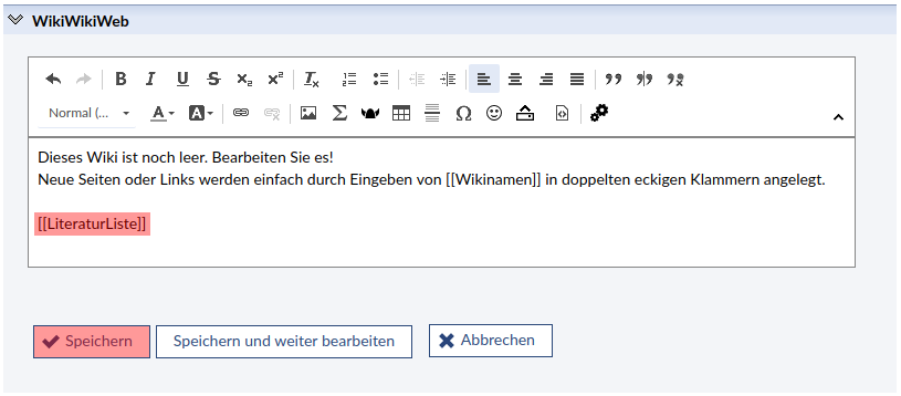- Klicken Sie auf bearbeiten und geben Sie in das Eingabefeld den Namen einer Wikiseite ein, z.B. LiteraturListe und anschließen klicken Sie auf speichern.