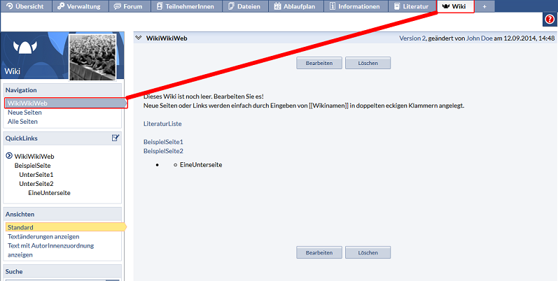 Es gibt jederzeit die Möglichkeit, zur Startseite zurückzuspringen. Klicken Sie dazu auf den Menüpunkt "WikiWikiWeb" innerhalb der Reiters "Wiki" der Veranstaltungsnavigation: