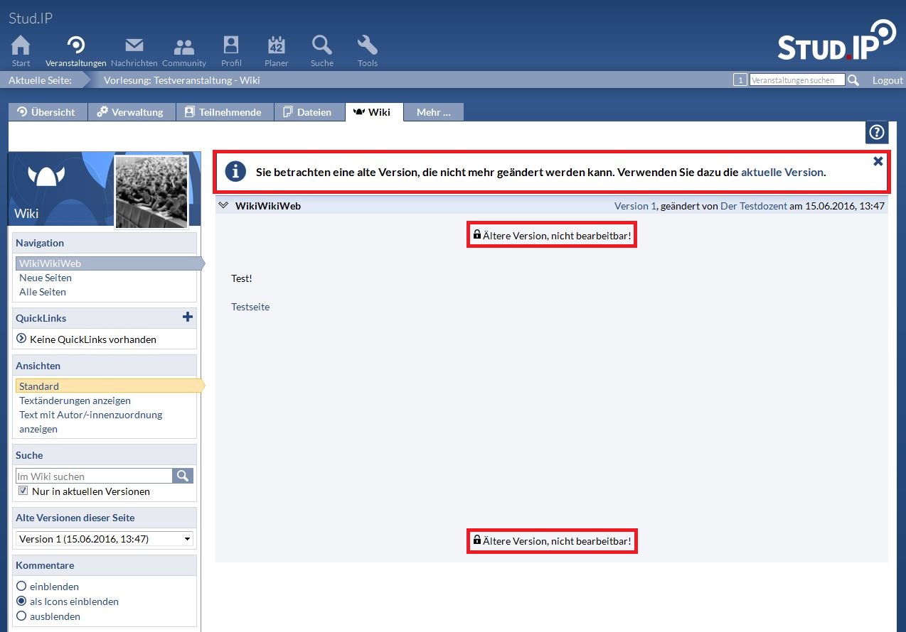 Beachten Sie, dass Sie alte Versionen nicht ändern können. Das wird Ihnen durch einen Hinweis an Stelle des gewohnten Bearbeiten-Knopfes verdeutlicht: