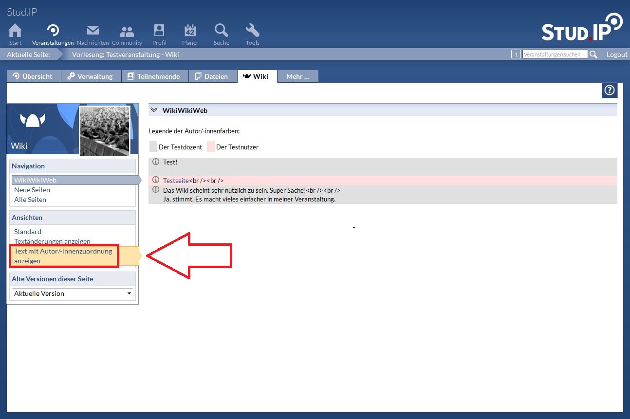 Die Funktion Text mit AutorInnenzuordnung anzeigen hingegen, zeigt Ihnen für die aktuelle Version, wer welchen Absatz geschrieben oder zumindest zuletzt geändert hat. Dies geschieht durch unterschiedliche farbliche Hinterlegung der Absätze, eine Legende über dem Text zeigt Ihnen die Farbzuordnung zu AutorInnen. Zusätzlich geben kleine Info-Buttons links neben den Absätzen beim Daraufzeigen mit dem Mauszeiger oder Anklicken Auskunft über die AutorInnenzuordnung.