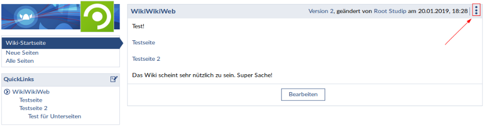 Als DozentIn oder TutorIn einer Veranstaltung haben Sie die Möglichkeit, bei entsprechender Berechtigung über das Aktionsmenü Wiki-Seiten zu verwalten. Dazu ist auf die drei übereinander liegenden Punkte zu klicken.