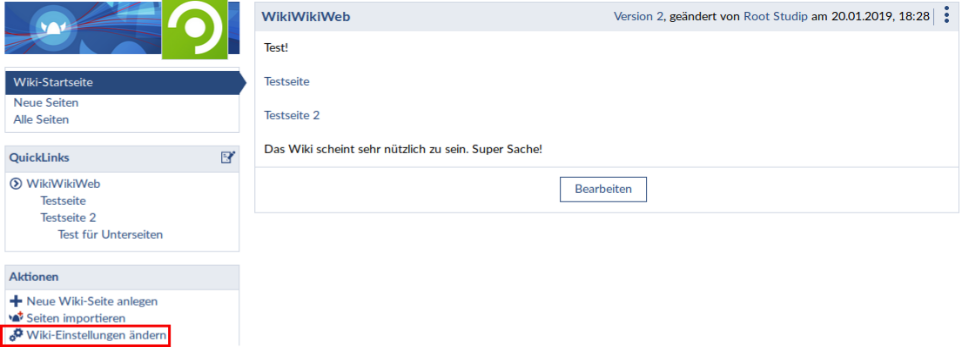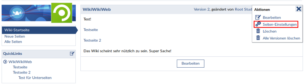 Um die Berechtigungen zu einer Wiki-Seiten anzuzeigen, ist im Aktionsmenü auf die Aktion „Seiten-Einstellungen“ zu klicken.