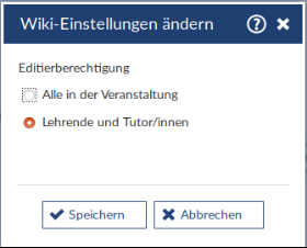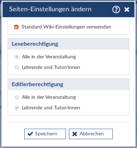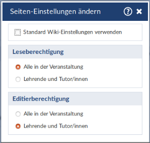 Die globale Editierberechtigungseinstellung für eine Veranstaltung kann über die Sidebar-Aktion „Wiki-Einstellungen ändern“ geändert werden. Die globalen Leseberechtigungeinstellung ist im Standard auf „Alle in der Veranstaltung“ gesetzt, damit die Wiki-Seiten per Default für alle in Teilnehmer in der Veranstaltung sichtbar sind. Einzelne Seiten können aber für die Studierenden über die jeweiligen Seiten-Einstellungen unsichtbar eingestellt werden.