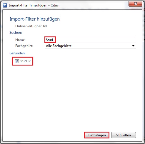4. Type into the field for names "Stud" (oder "Stud.IP") . Automatically for the search results you can find "Stud.IP". Set a tick next to the search result and click on "add".
