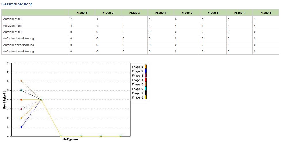 Participans can answer the motovotoring questions after they finished they tasks.On the statistik page you can see two tables and the corresponting grafic.