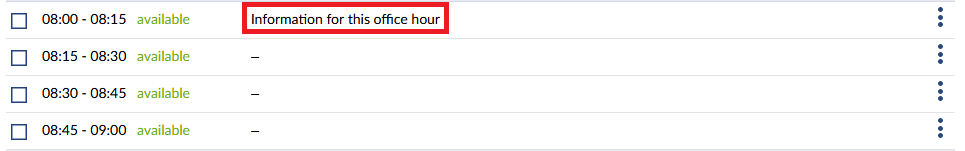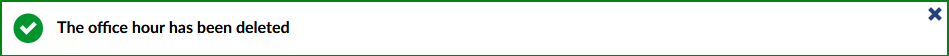 Here, you can delete an unbooked office hour. Please be aware that already reserved consultation dates need to be cancelled, before they can be deleted. You will need to confirm the deletion.