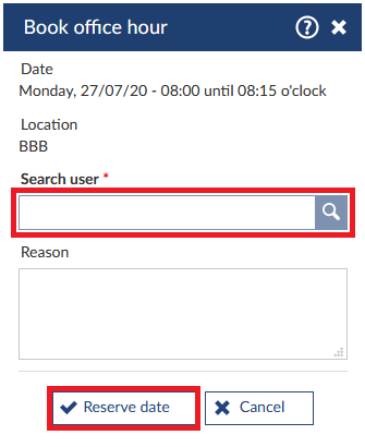 Enter the name of the person, you would like to book a date for, within the field "Search user" and choose the right user. Optional, you can state a reason for reservation. Confirm the resarvation by clicking