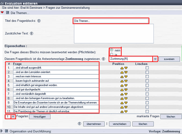 You are now on the question block level and can adapt the questionnaire to your conceptions by changing, deleting or adding questions.